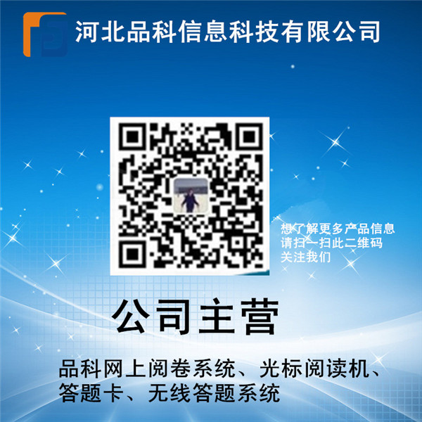 品科為全國用戶提供信息卡 機讀卡 高考網上閱卷系統、多功能光標閱讀機、外包型閱卷服務以及包括答題卡、智能軟件定制服務及答題卡讀卡機,主要應用于考試閱卷評分。教學評估,和各類問卷等。